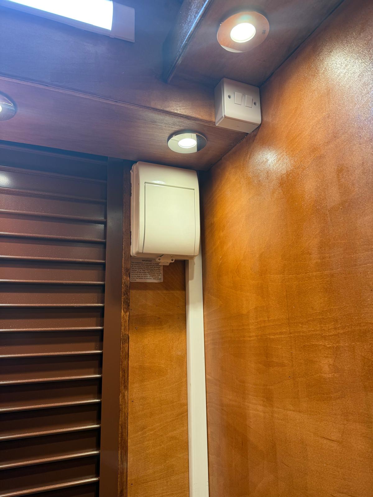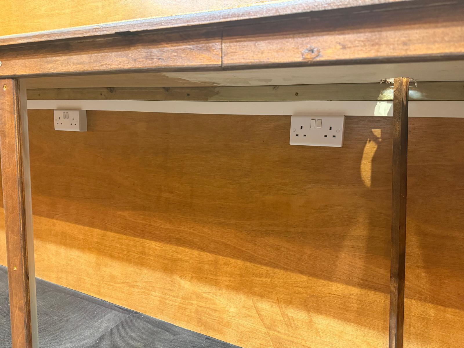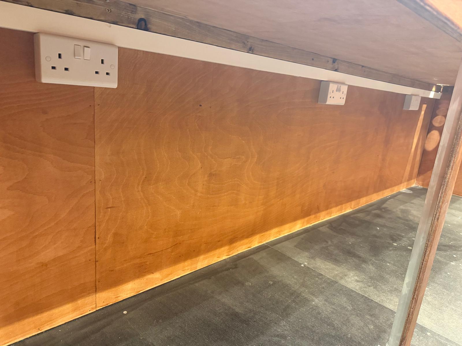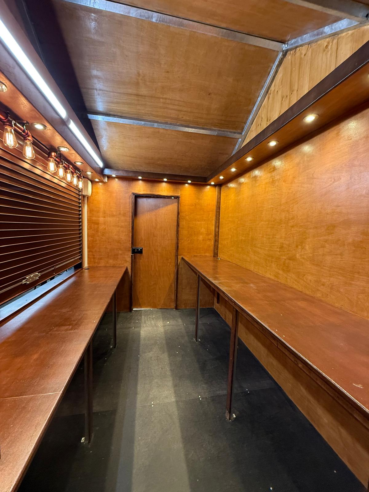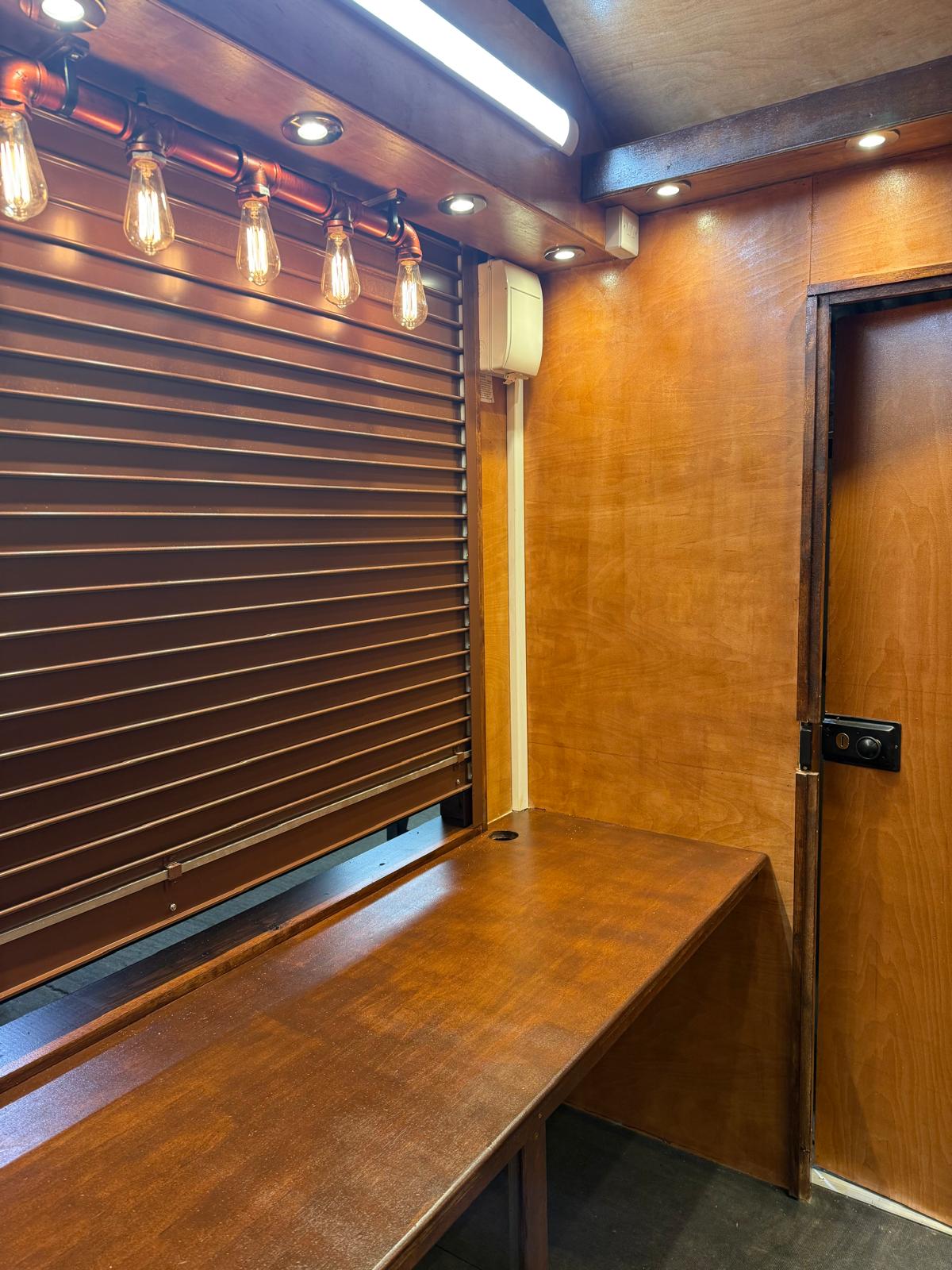 **10ft x 7ft Premium Portable Hut** This robust, fully-equipped mobile unit combines exceptional craftsmanship with practical functionality, making it ideal for street food vendors, pop-up retail, market traders, and event operators. **Structural Excellence** Built on a galvanised steel frame with integrated jacking points for 4-way stabiliser jacks and forklift access, ensuring secure positioning and easy transport. The timber frame is clad externally with tongue and groove wooden boards, internally lined with 12mm plywood, and finished with professional staining and varnish for superior weather resistance. **Roof & Access** The apex roof features roofing felt underlayment topped with premium red cedar wood tiles for authentic aesthetics and durability. Two 18" hinged roof extensions maximise operational space, whilst the aluminium roller shutter with locking mechanism and cedar tile lined 30" hatch provide a secure, weather-tight closure. **Interior Workspace** Two wooden counters and over head shelving on all sides create efficient storage and display. Comprehensive lighting includes spotlights around top shelving, two strip lights, and two decorative 5-bulb steampunk fixtures. A 6" hinged customer shelf enhances accessibility. Heavy-duty single door with lock and stays ensures security. **Electrical** 16-amp mains connection with fuse box, six double sockets, light switch, and external 16-amp outlet for flexible power management.